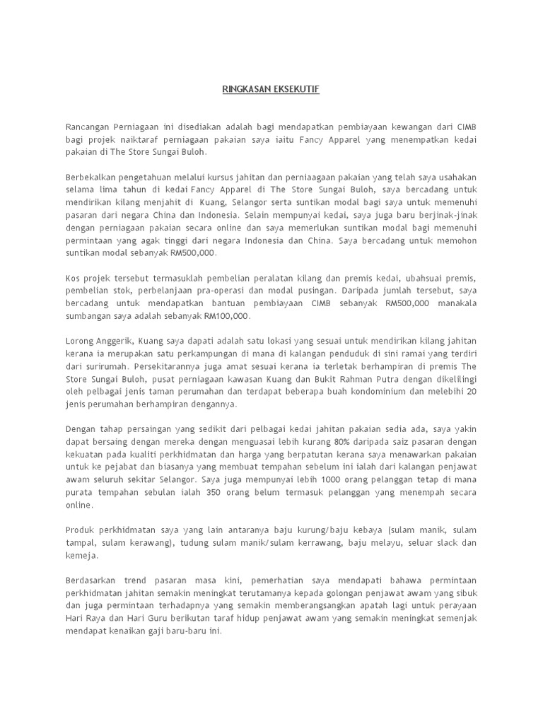 .ringkasan eksekutif rancangan perniagaan ini disediakan adalah bagi mendapatkan pembiayaan kewangan dari cimb bagi projek naiktaraf perniagaan pakaian saya iaitu fancy apparel yang menempatkan kedai pakaian di the store sungai buloh. Ia juga harus menyatakan dengan jelas tujuan rancangan perniagaan anda disediakan. Contoh ringkasan eksekutif atau executive summary. Tepubina perumahan perniagaan dan perkhidmatan perindustrian institusi dan kemudahan masyarakat. Dengan rancangan perniagaan untuk kegunaan dalaman tuliskan terakhir.